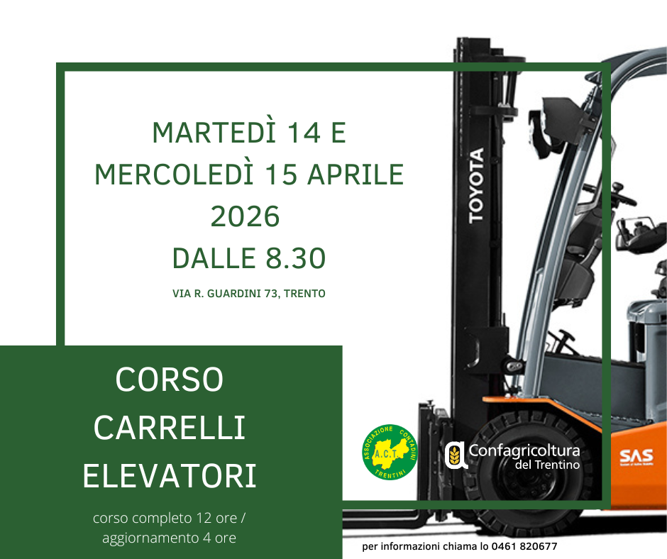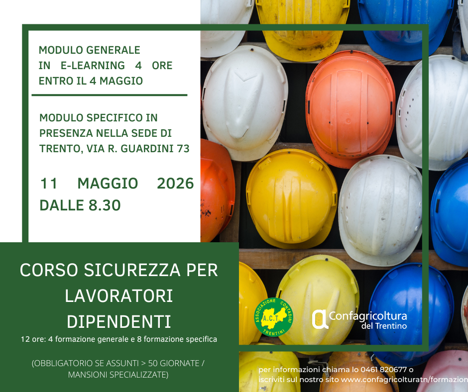 CONFAGRICOLTURA TRENTINOI NOSTRI SERVIZILE CONVENZIONII CORSI DI FORMAZIONE PROSSIMI CORSI FORMATIVI Clicca qui per l'iscrizione Clicca qui per l'iscrizione Clicca qui per l'iscrizione Clicca qui per l'iscrizione Clicca qui per l'iscrizione Clicca qui per l'iscrizione ULTIME NOTIZIE Linee di indirizzo per la protezione dei lavoratori dal calore e dalla radiazione solareRischio da stress da calore e da esposizione a radiazione solare ultravioletta Linee di indirizzo per la messa a disposizione di alloggi per i lavoratori stagionali in ambito ruraleDL 146 Novità in materia di salute e sicurezza sul lavoro Convenzione con SAPI per l'attività di medico competente per la sorveglianza sanitaria Agrijob: la piattaforma per le offerte di lavoroConvenzione polizza infortuniIndicazioni sulle attività di controlli ufficiali nella produzione primariaRegistro dei Farmaci informatizzato Misure fitosanitarie di contenimento nel territorio della PAT contro il colpo di fuoco battericoNuovo servizio di consulenza assicurativa per gli associati Servizio sportello sicurezza sul lavoro Archivio news ed eventi I SERVIZI ALLE IMPRESE SERVIZI FISCALI SERVIZIO PAGHE CENTRO ASSISTENZA AGRICOLA ASSISTENZA CONTRATTUALE I SERVIZI ALLE PERSONE CAF DIPENDENTI E PENSIONATI PATRONATO SERVIZI INPS E WELFARE GESTIONE COLF E BADANTI PREVIDENZA COMPLEMENTARE LA NOSTRA RIVISTA Il primo numero 2026Il sesto numero 2025Il quinto numero 2025Il quarto numero 2025Il terzo numero 2025Il secondo numero 2025Il primo numero 2025 LA NOSTRA RIVISTA TECNICA Sfoglia tutti i numeri Via Romano Guardini, 73 38121 TRENTO (TN) 0461 820 677 0461 825 837 info@confagricolturatn.it seguici sui nostri social Facebook Instagram Codice Fiscale 80011210228Privacy PolicyCookie Policy Politica per la sicurezza delle informazioni